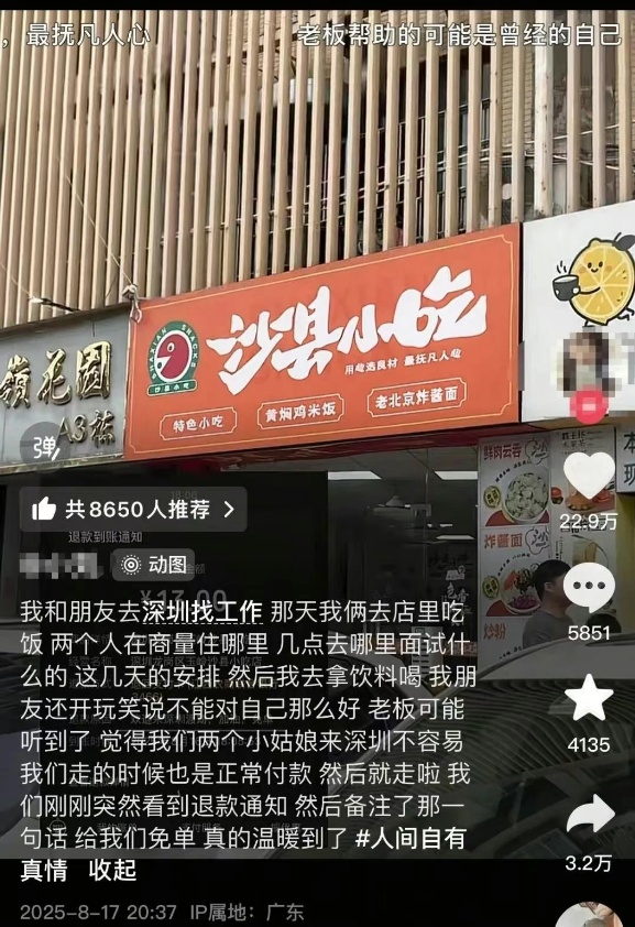 食物的钱突然回来了?也包括在一个神秘的消息中...最近,一个简短的视频在互联网上很受欢迎。尽管这张照片只是被图片冻结了,但它得到了一种方式 - 成千上万的喜欢,使许多网民说:“真是太热了!”毕业生在进食时谈论工作。老板悄悄地成为了慈善机构。小刘和小歌是毕业生,他们今年去了深圳找到工作。 8月16日下午,两人去了朗冈区的Shaxian小吃店吃晚饭。他们两个在吃饭时讨论了他们的实习,寻找工作,晚餐后离开。下午6点左右,他们的电话突然收到了13元的退款。起初,他们认为这是系统中的一个错误,但是当仔细观察后,他们发现是小吃吧,采取了主动性将其归还,并说了“来吧,免费!”之类的笔记。后来,两名毕业生在视频平台上发布了这一事件,并在夜晚。询问后,潘先生,零食酒吧 - 所有者说:“这是我的伴侣退还了钱。他告诉我,两个小女孩并不容易。我只是认为这是一个很好的手势。我妈妈还告诉我,如果他们能出来,他们可以帮助我。”尽管价格不高,但“有点热。”潘先生以前经历过一些商业活动,并成为两个孩子的父亲。今年3月,我开始与黄先生的伴侣一起经营这种小吃。看到两个女孩的处境,潘先生充满了同情心。他说,尽管价值不大,但它会使它更热。他是一个见面并且没有帮助别人的人。他仍然可以用餐来帮助他们。寻找工作的两位毕业生说:“我们最有效的感觉是我们在哭。这是我们第一次感到炎热的时刻。我希望他的生意会繁荣,他会越来越好,更好,我们会变得越来越好。”感恩节两位毕业生潘先生和他的伴侣说,人们有时会遇到困难或陷入困境。目前,帮助他人以自己的能力并使他人变得更甜蜜是他们的最初目标。我也希望两位毕业生可以在深圳找到工作并留下来。潘先生说:“这都是马斯马尔的事情。我也希望当他们遇到相同的情况时,他们可以做些小的行动。只有一点好意。”网民对此发表了评论,“我将永远移动这种最简单的热量!” Shenzhen确实是一个炎热的城市。深圳
